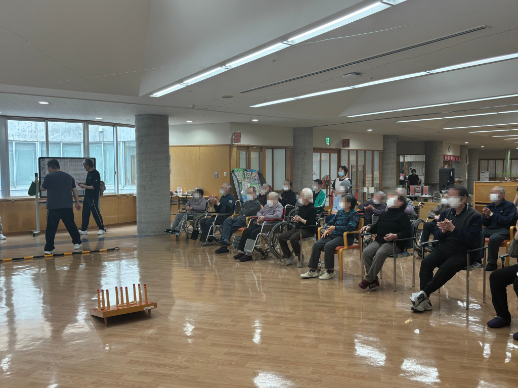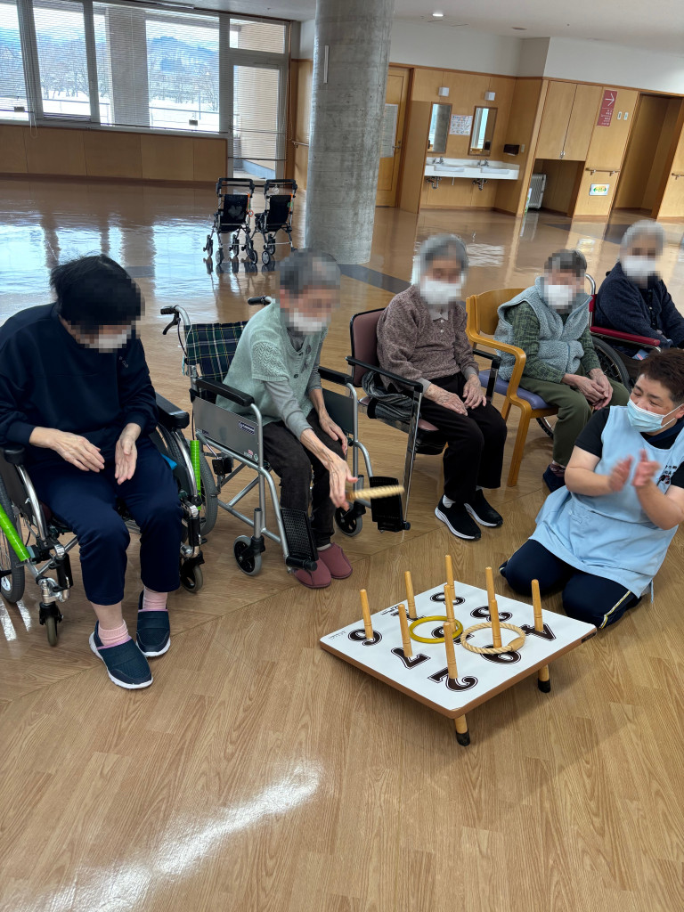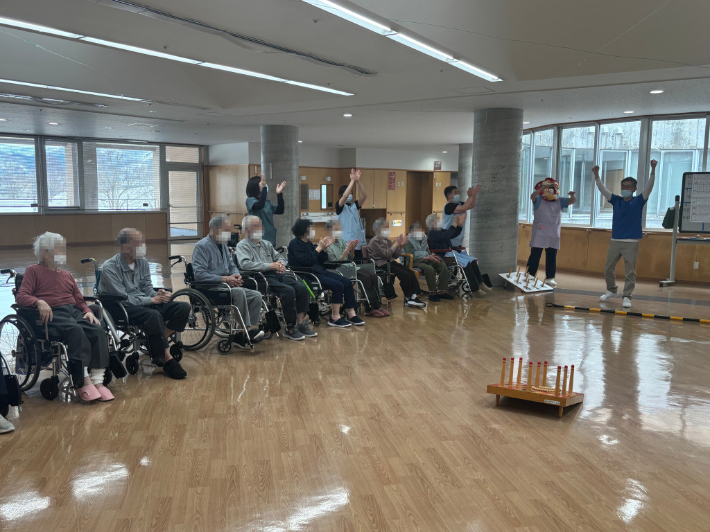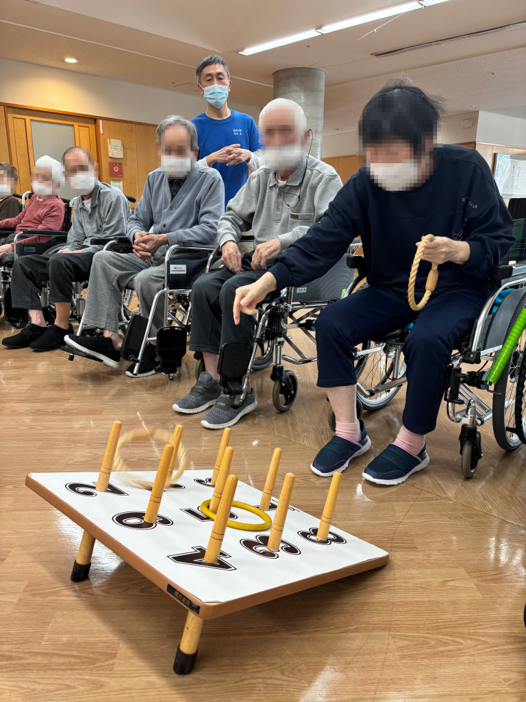 準備体操でからだをほぐしたあと、介護医療院と通所リハ対抗で輪投げ大会を行いました。勝負は職員対決のサドンデスまでもつれ込むドキドキの展開。参加者は手拍子で盛り上げ、熱い戦いとなりました。